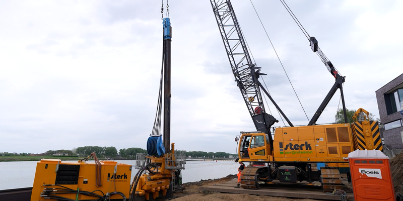 De locatie bracht stevige uitdagingen met zich mee: een harde, zanderige bodem met stenen, beperkte werkruimte en nabijgelegen woningen. Een traditionele aanpak was hier niet haalbaar. Door de inzet van de Crush Silent Piler, die gelijktijdig met een grote grondboor door de harde lagen boort, kon Sterk de damwanden veilig en nauwkeurig drukken, uniek in Nederland!